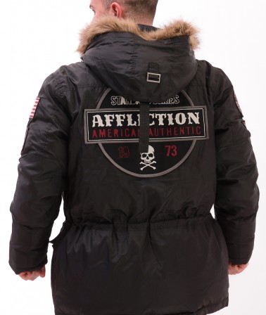 Мужская зимняя куртка на пуху Affliction Alter Ego с капюшоном. Длинный рукав, капюшон с мехом, большие передние карманы, застежка на молнии и заклепках.