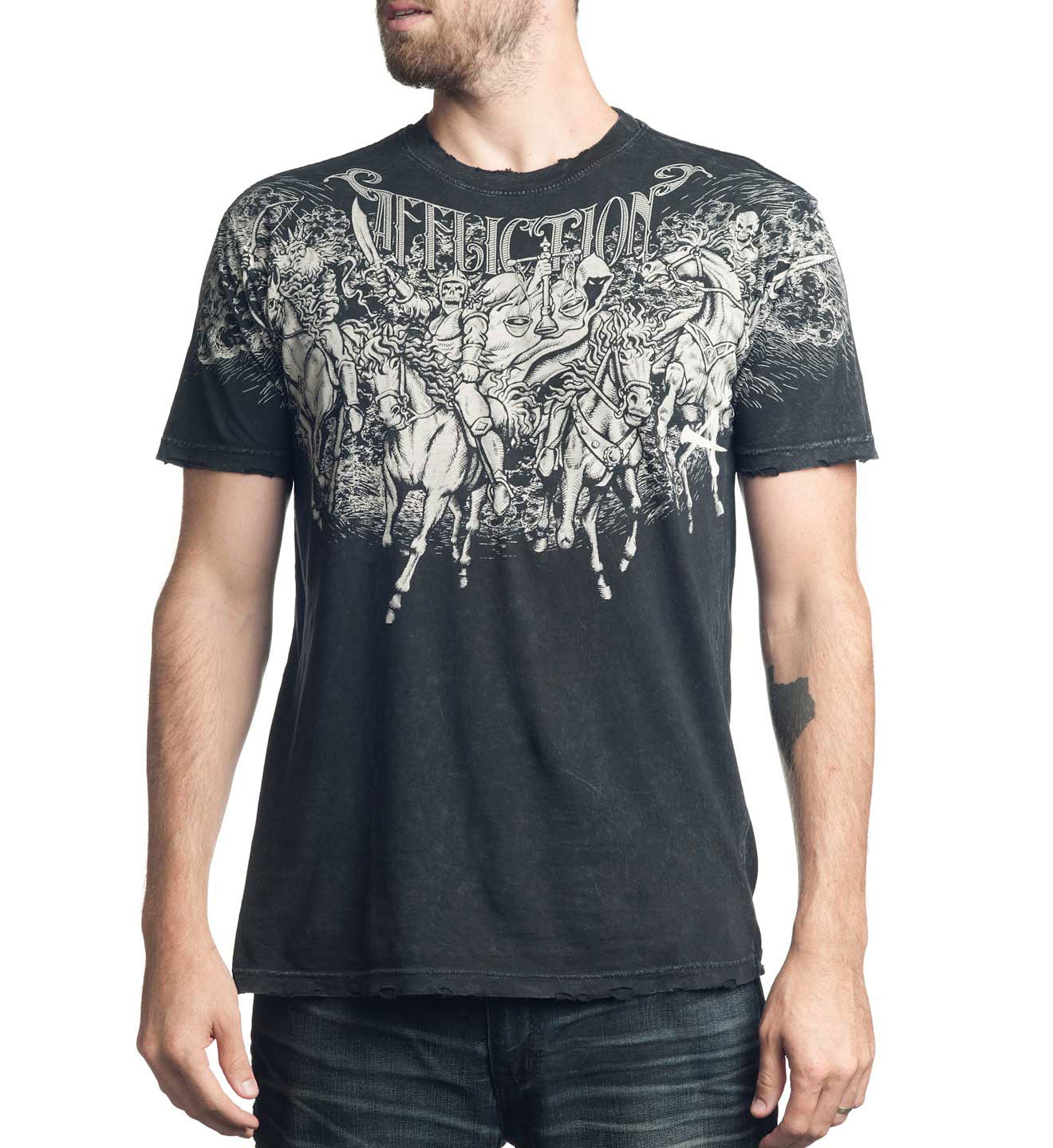 Футболка Affliction Horsemen из оригинальной коллекции Afflction. Модель создана из 100 % натурального хлопкового материала. Детали: фирменная состаренная ткань от Affliction, уникальное нанесение рисунка на футболку.