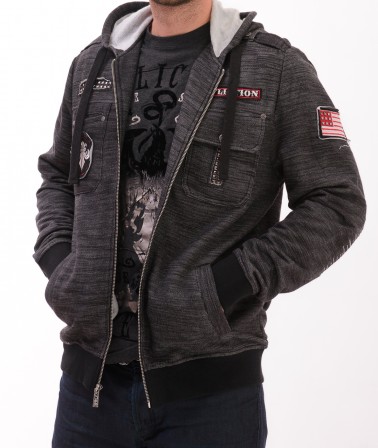 Куртка Affliction Up For It Zip Hood. Знаменитый байкерский стиль от дизайнеров Affliction отлично воплощен в этой модели. Приталенная конструкция прекрасно подчеркивает фигуру. Куртка декодирована фирменными элементами.