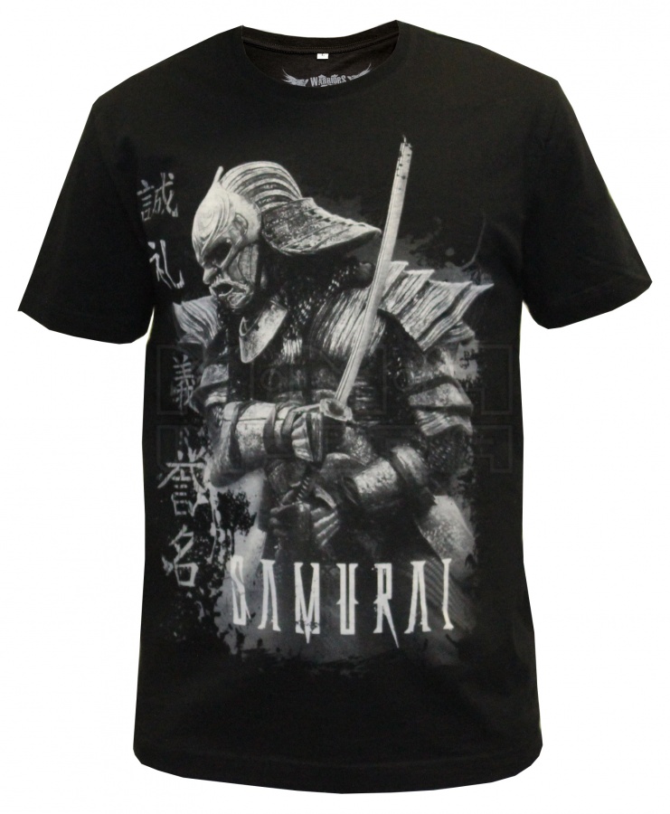Отличная темная футболка из серии Warriors. Изображен самурай во всей экипировке, а также нанесены японские иероглифы и слово "Samurai".