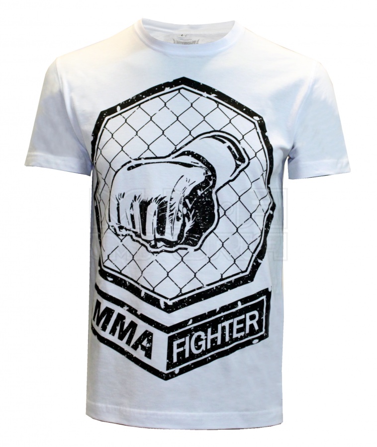 Светлая футболка из серии Warriors. На ней изображен шингарт на фоне сетки, своеобразные символы смешанных единоборств.