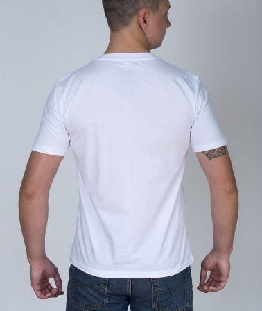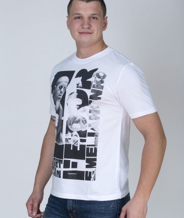Белая футболка. Модель создана из 100 % натурального хлопкового материала. Детали: модный крой, на лицевой стороне крупный принт с изображением известного спортсмена Федора Емельяненко и надпись "FEDOR EMELIANENKO, FIGHT TEAM"