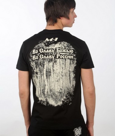 Футболка Во Славу Божью, Во Славу России черная, эксклюзивная оригинальная футболка от чемпиона мира по смешанынм единоборствам и боевому самбо Федора Емельяненко, сделанная по его просьбе и лично одобренная им.