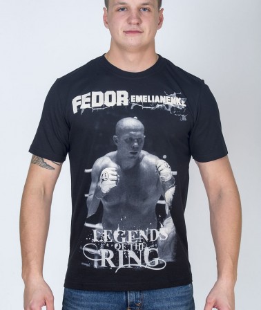 Черная футболка. Модель создана из 100 % натурального хлопкового материала. Детали: модный крой, на лицевой стороне крупный принт с изображением известного спортсмена Федора Емельяненко и надпись "Legend of the Ring" (пер. Легенда ринга)