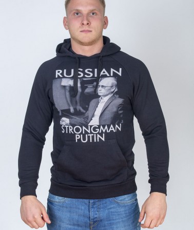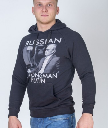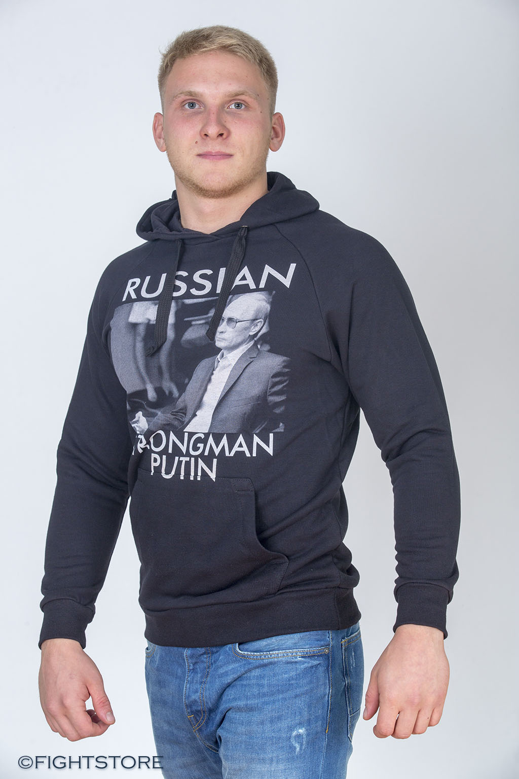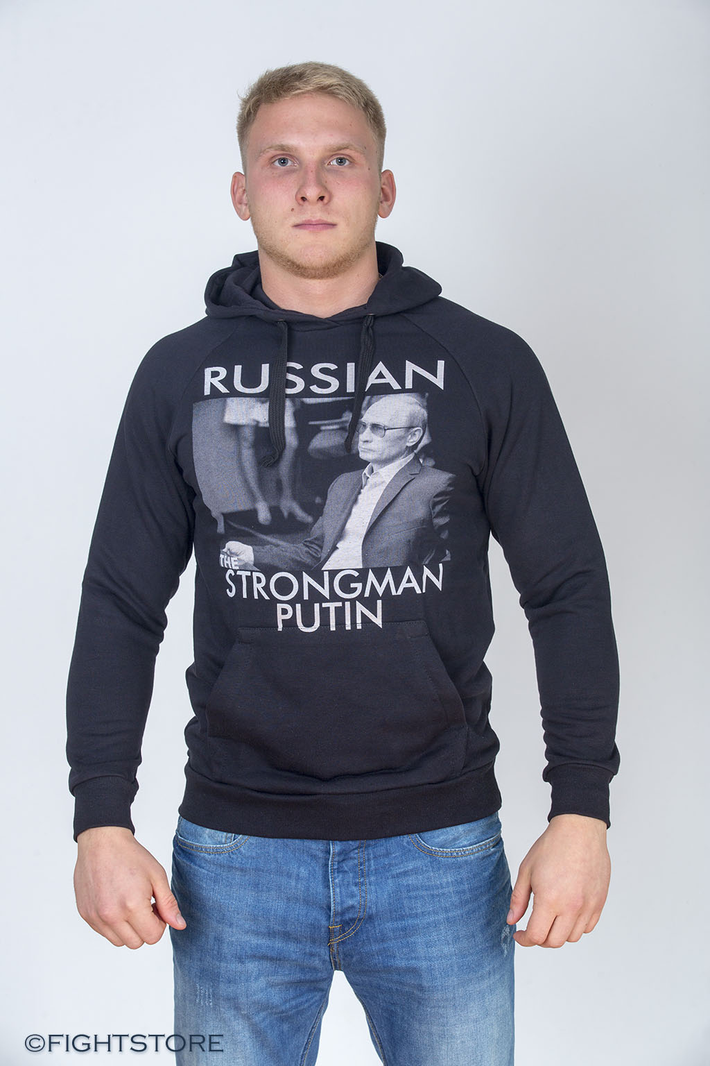 Толстовка В. Путин StrongMan с крупным портретом Владимира Путина. Кофта удобно сидит и комфортно облегает фигуру. Спереди надпись Russian strongman Putin( пер. с англ. русский сильный мужчина Путин).