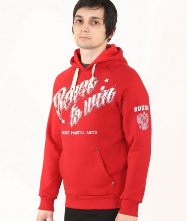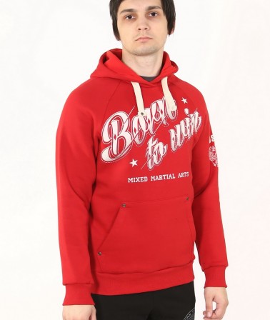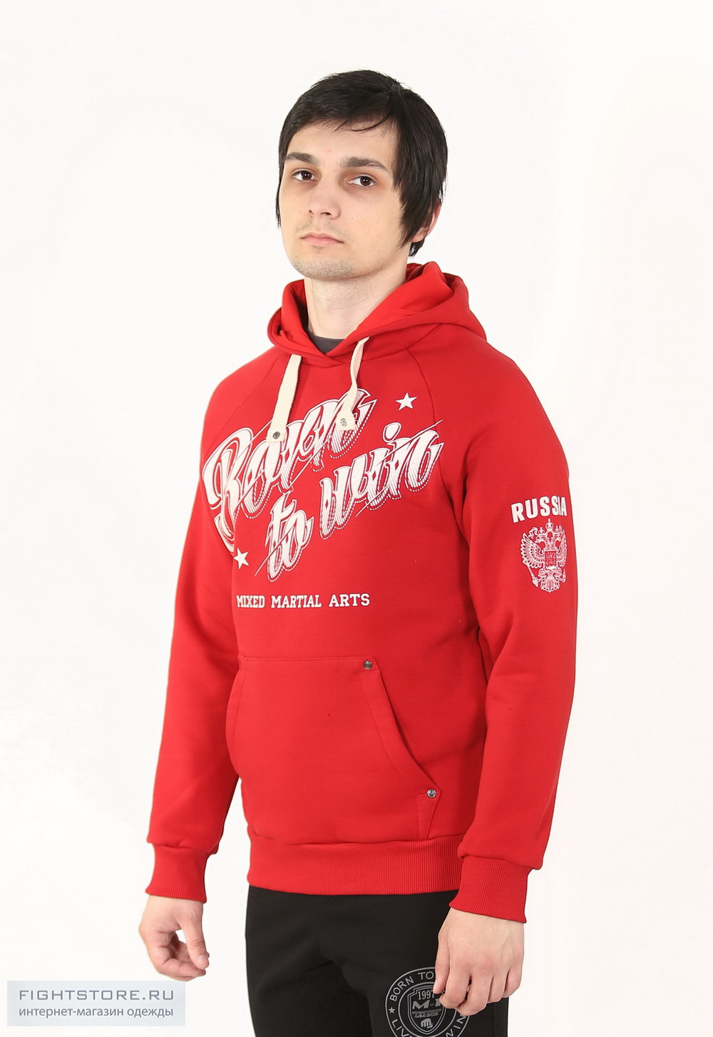 Толстовка для поклонников смешанных единоборств ММА. Спереди надпись Born to Win (в пер. Родившийся побеждать), ниже надпись Mixed Martial Arts (смешанные боевые единоборства). Сбоку на левом рукаве надпись RUSSIA и изображение двуглавого орла со скипетром и державой. Сзади нанесение - надпись RUSSIA.