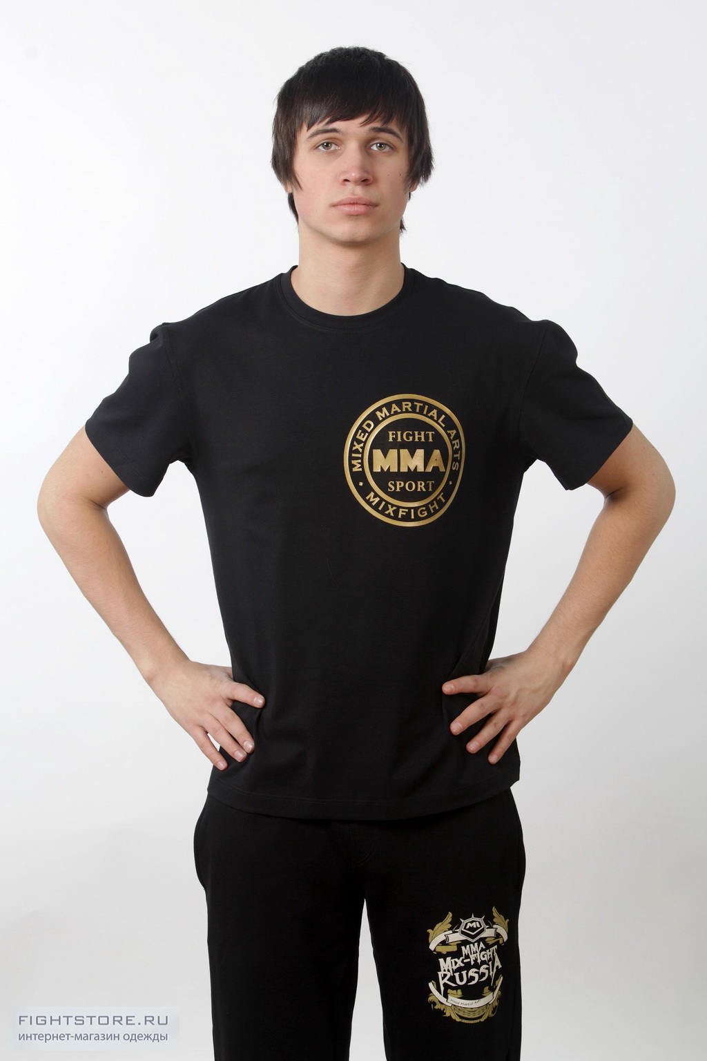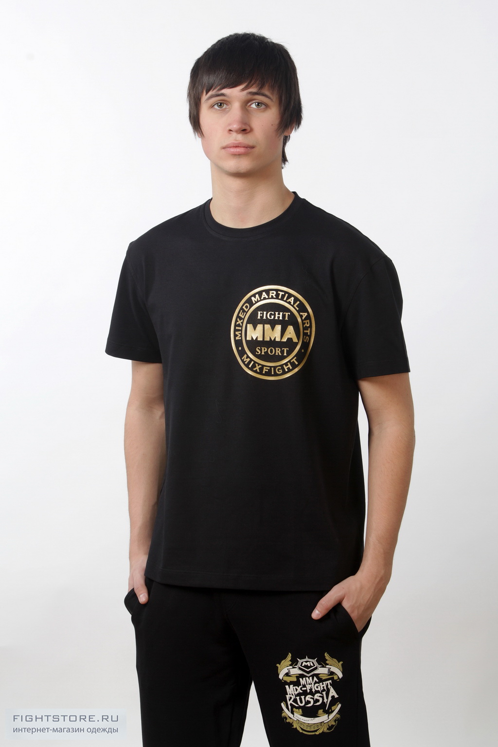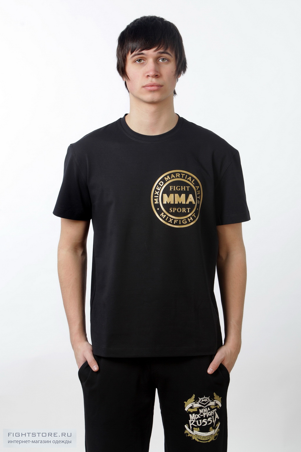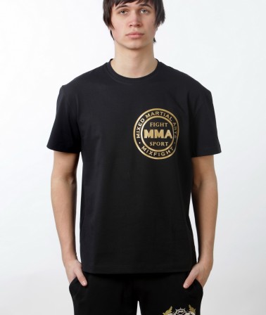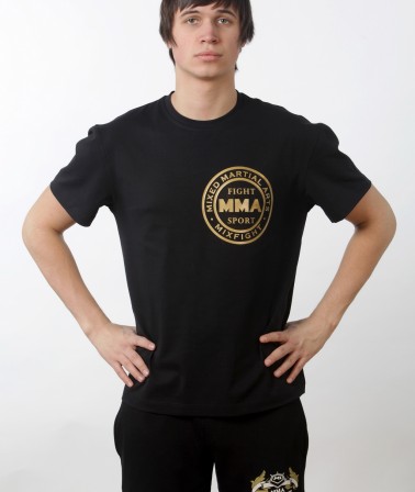 Футболка MMA черная с золотым логотипом выполнена из материала используемом модным домом Armani. Приятный на ощупь мягкий однородный материал, не теряющий форму при длительном использовании, хорошо сидит и выгодно подчеркивает фигуру человека.