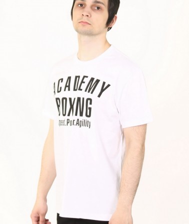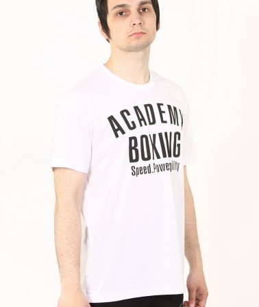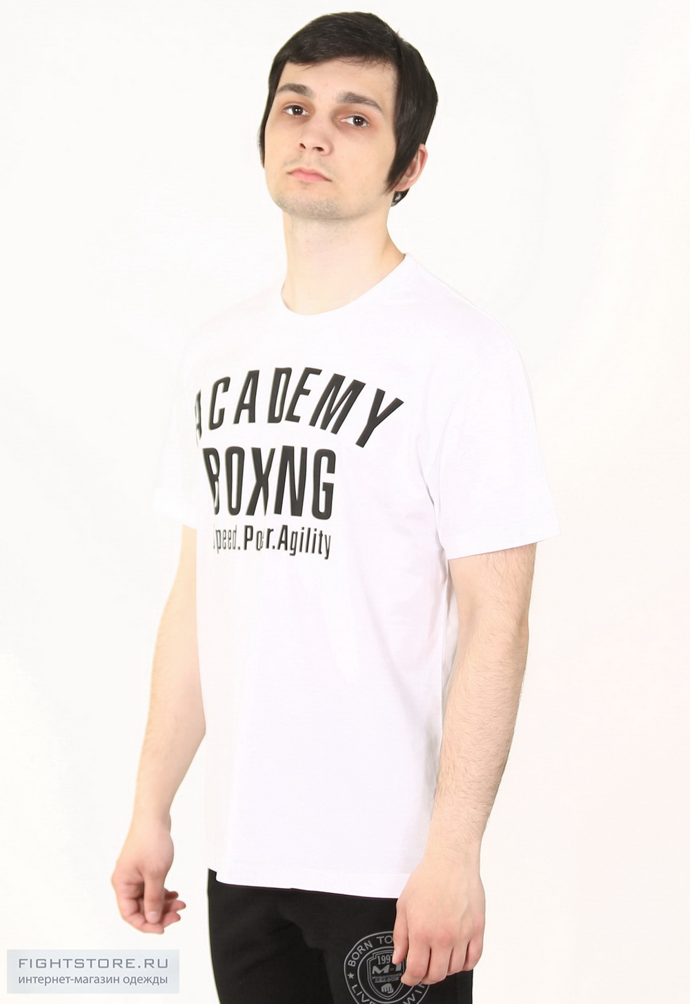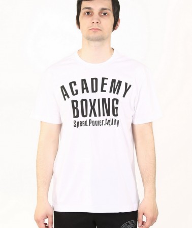Футболка для поклонников бокса. Спереди надпись Academy BOXING (пер. с англ. Школа бокса), ниже надпись Speed. Power. Agility (в пер. с англ. Скорость. Сила. Ловкость).