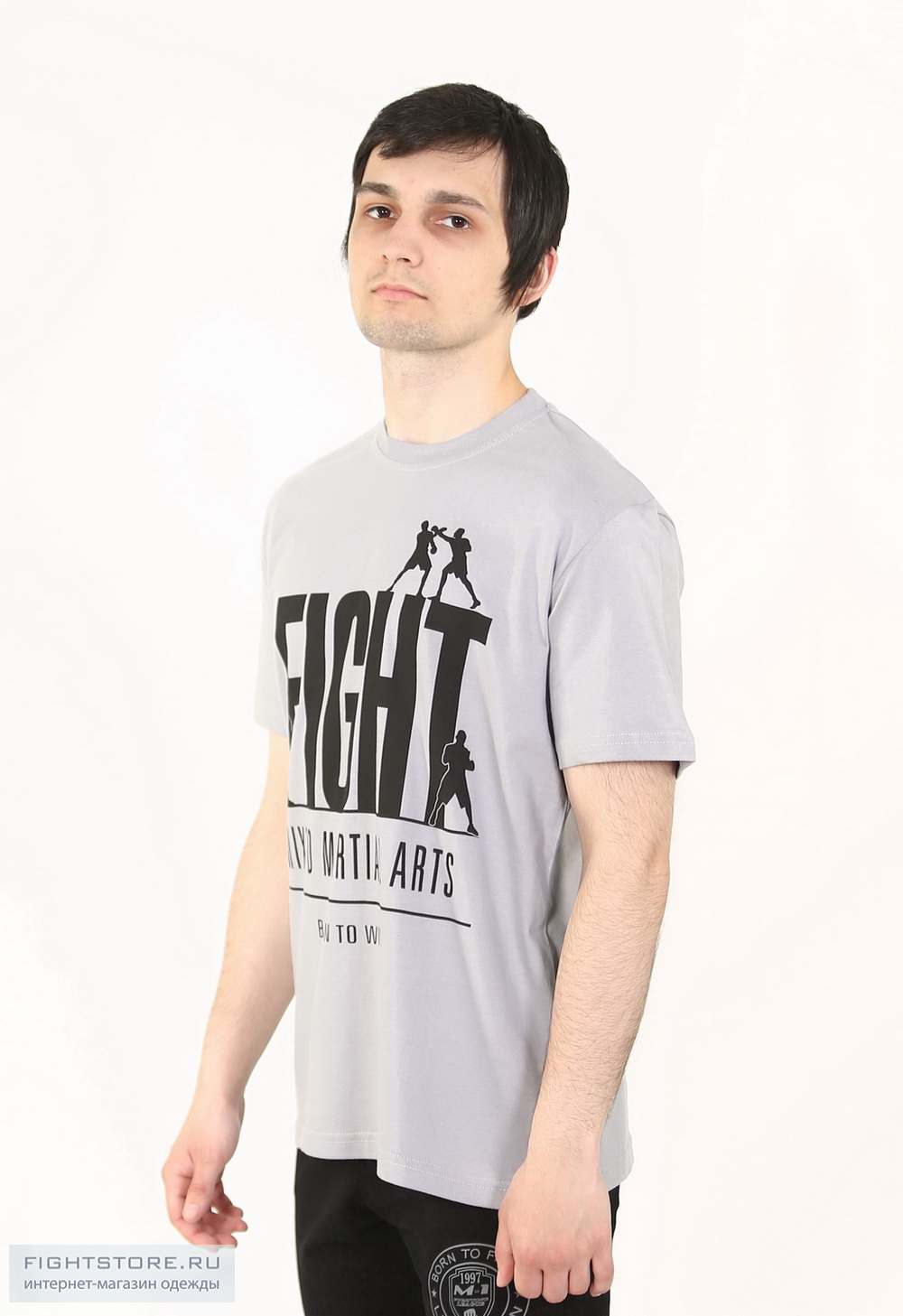 Футболка FIGHT мма серая со стильным изображением. Надписи Fight (пер. Бой, Борьба). Mixed Martial Arts - смешанные единоборства. И лого на котором изображены бойцы.