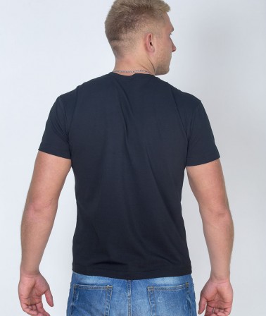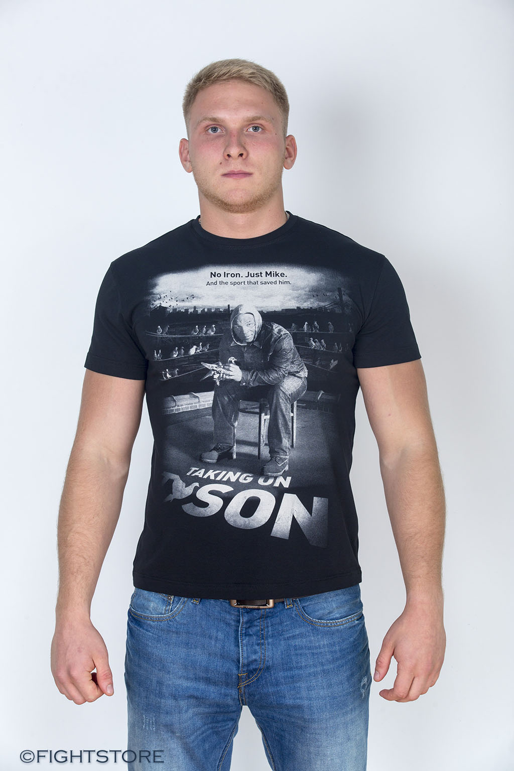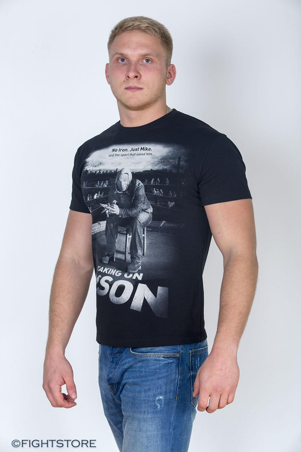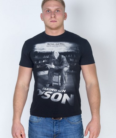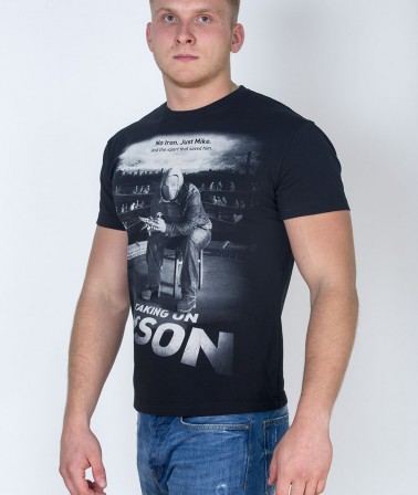 Черная футболка стрейтч. Модель создана из натурального хлопкового материала, содержащего нити эластана. Детали: модный крой, на лицевой стороне крупный принт с изображением известного боксера Майка Тайсона и надпись: Not Iron, Just Mike. And the sport that saved him. (пер. Не железный, просто Майк. И спорт, который его спас)