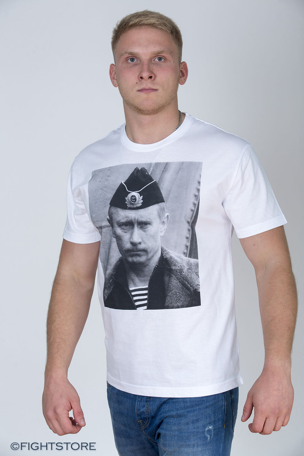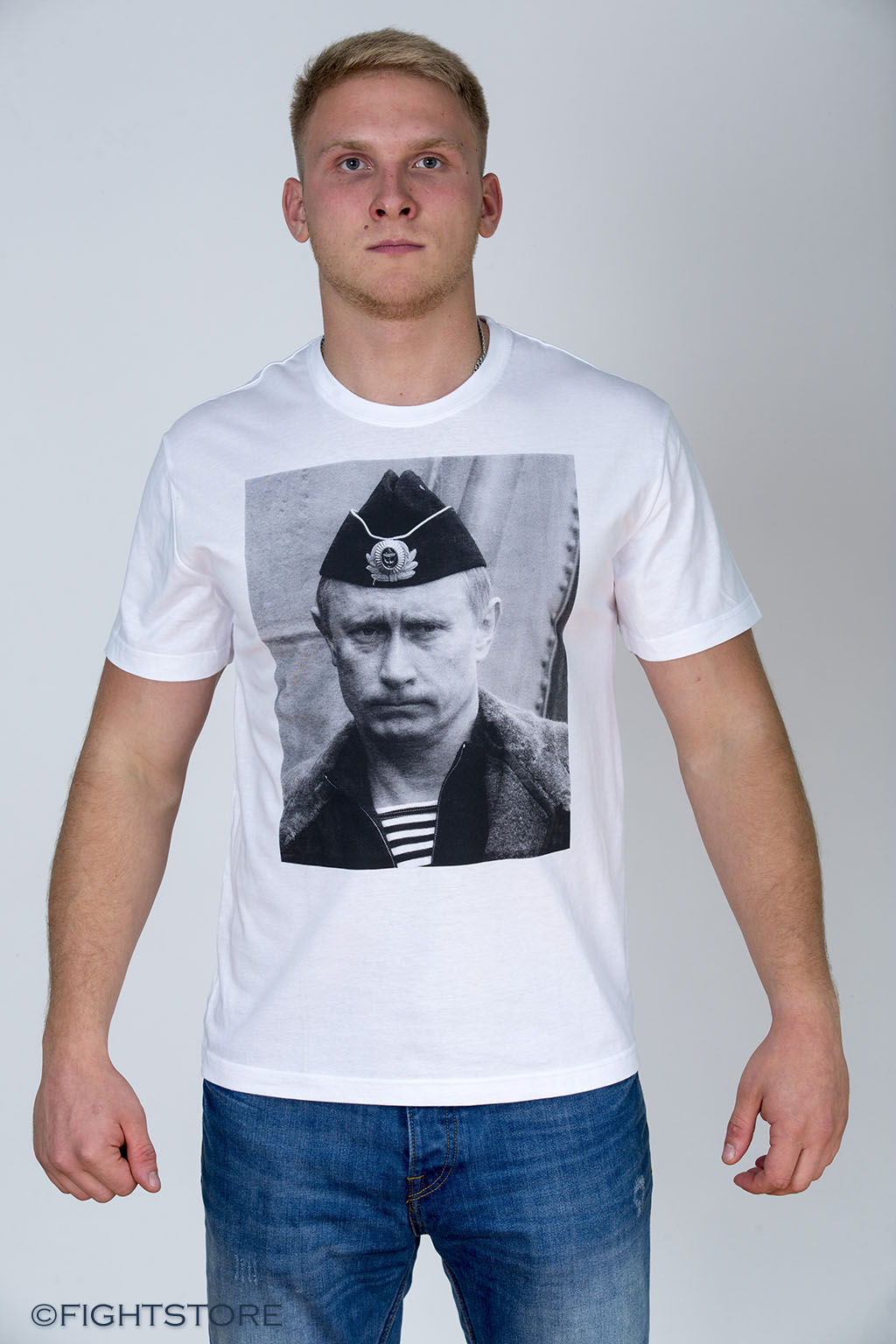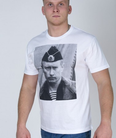 Футболка В.Путин в тельняжке белая с изображением Владимира Путина во флотской форме. Футболка удобно сидит и комфортно облегает фигуру. Дорогой материал. Яркое и надежное нанесение. Футболка не усаживается при многочисленных стирках.